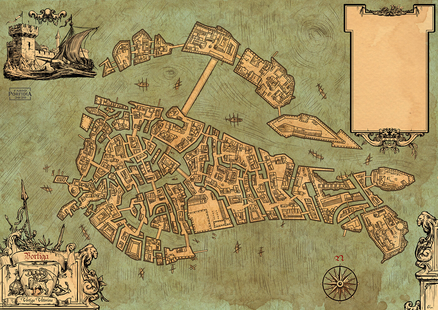 - Borgo di Lisca (l'Arrondissement de l'Arête) est le quartier noble de la ville avec ses larges avenues et ses demeures cossues. C'est le plus proche de la terre et celui à le moins subir les assauts de la mer. Plusieurs grandes familles disposent de grandes dépendances en plus de ces demeures parfois croulantes et anciennes. La garde de la ville est très active dans ce quartier tranquille de jour comme de nuit.